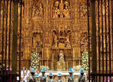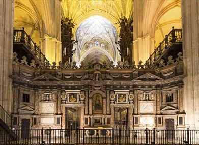 Le Retable majeur est le plus grand de toute la chrétienté. Une œuvre d'art gigantesque entourée d'une grande grille. Réalisé en bois polychrome, il se compose d'un ensemble de 44 reliefs et de plus de 200 figures de saints. Sa surface fait près de 400 mètres carrés. À l'intérieur de la cathédrale se trouve également la tombe de Christophe Colomb. Forte de son patrimoine artistique, elle est considérée comme l'une des plus riches pinacothèques d'Espagne. On peut y voir des œuvres de Murillo comme le portrait de San Fernando, Le Baptême du Christ ou l'Immaculée Conception ; Saintes Juste et Rufine de Goya et des œuvres d'Alonso Cano, Francisco Herrera el Mozo ou encore Luis de Morales, entre autres. Parmi les sculptures, on compte des œuvres de Pedro Roldán, Alonso Martínez, Juan de Mesa, ou que Martínez Montañés a réalisées en 1603 pour la Cartuja de Séville, Le Christ de la clémence ou Christ des Calices, chef-d'œuvre du baroque sévillan, que l'on peut désormais admirer dans cette enceinte. Parmi les nombreuses pièces d'orfèvrerie, il faut évidemment nommer la Custodia réalisée par Juan de Arfe en 1580.