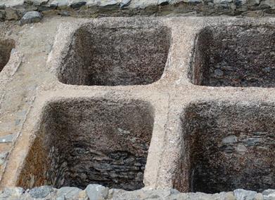 On distingue trois secteurs bien distincts : le secteur sud, délimité par un mur qui le séparait de la plage adjacente, était réservé aux activités administratives et de stockage. Une porte, ultérieurement bloquée par un enclos de pierre, permettait la communication de l'usine avec la mer. Elle conserve des vestiges d'un ensemble de chambres rectangulaires où l'on a découvert plus de 700 monnaies, même si les couches archéologiques successives lui donnent un aspect de labyrinthe.