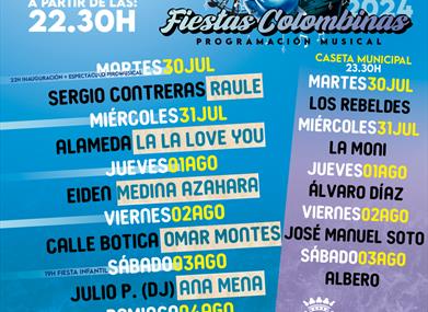 Les Fêtes Colombinas, déclarées fêtes d’intérêt touristique d’Andalousie, sont les fêtes patronales de Huelva. Depuis 1882 elles sont célébrées en hommage aux navigateurs et marins qui quittèrent le port de Palos, aux côtés de l’amiral Christophe Colomb, en route vers les Indes.